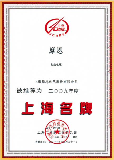 上海摩恩電氣股份有限公司多年被上海市名牌產品管委會評委“摩恩牌”電纜為上海名牌產品
