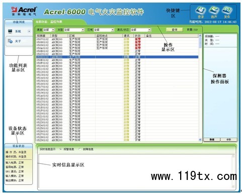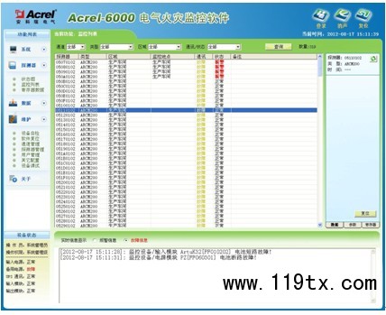 Acrel-6000電氣火災監控系統是本公司自主研發的用于接收剩余電流式電氣火災探測器等現場設備信號,以實現對被保護電氣線路的報警、監視、控制、管理的運行于計算機的工業級硬件/軟件系統。本系統應用于大型商場、生活小區、生產基礎、辦公大樓、商場酒店等區域的消防控制中心,對分散在建筑內的探測器進行遙測、遙調、遙控、遙信,方便實現監控與管理。本系統采用標準的Modbus現場總線將具有通信功能的探測器相互連接起來,當現場保護線路中的被探測參數超過報警設定值時,能發出報警信號、控制信號,能指示報警部位并保存報警信息。
