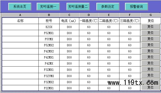 本界面主要實現遙調功能,運行人員可在參數設定報表查詢相應回路的剩余電流越線報警值,根據現場實際需要對剩余電流越線報警值進行設置。同時也可以對報警儀表進行遠程復位,故障報警解除時按復位鍵進行遠程復位,方便用戶的使用。