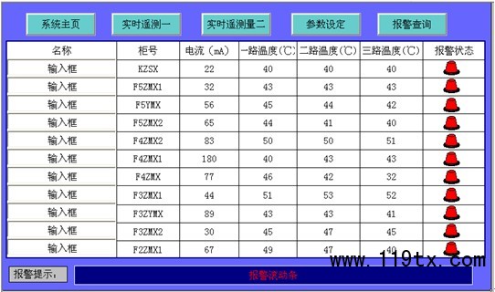 現場AKH-0.66L采集數據上傳到本界面,客戶可根據需要對回路名稱進行修改,方格內可以顯示相應柜子剩余電流實時值,數據可周期性更新。當剩余電流實測值大于報警設置時,系統報警狀態指示燈會自動閃爍。界面下端的報警提示滾動條會自動提示報警回路名稱,方便運行人員檢查處理故障。