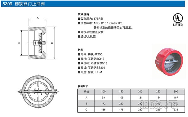 UL認證消防對夾雙板式止回閥具有重量輕,緊湊的對夾式結構,性能優異,具有氣密性關閉性能的彈性閥座。 雙彈簧均勻分布負載力,反應更加迅速。