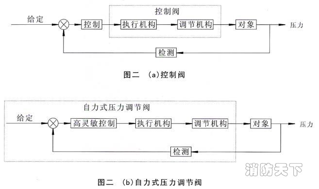 自力式壓力調節閥則既不需外來能源,又不需要接受外來控制儀表信號,僅靠被調介質的壓力信號,便可實現壓力調節。兩者區別可見圖二。