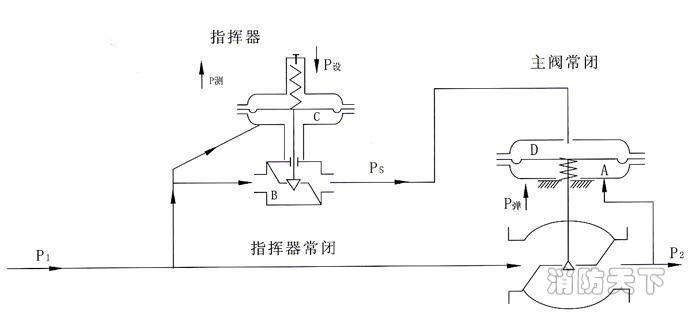 該閥采用先導式結構,有兩個薄膜執行機構(指揮器和主閥各一個)閥后壓力 不直接控制主閥芯,而是指揮器執行機構控制閥門主閥的開和關,原理如下: