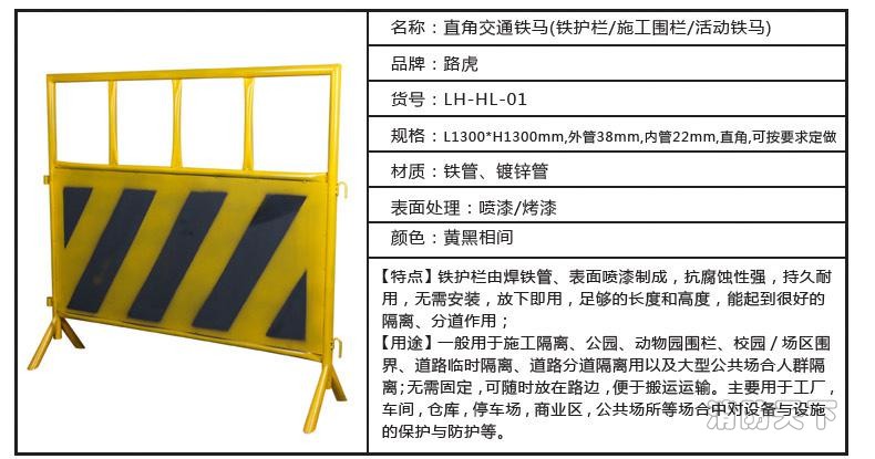2、鐵馬款式新穎,安裝方便,道路防障,可作圍欄,靈活移動(dòng)。安裝輕便快捷,無(wú)需吊機(jī),無(wú)須作任何路面施工即可安裝,儲(chǔ)存方便可靠齊放置節(jié)省地方,產(chǎn)品可回收,無(wú)污染;