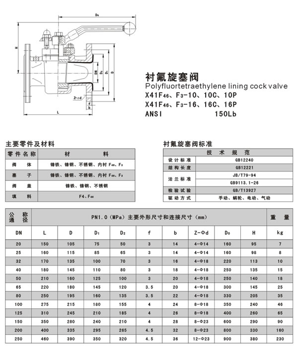 襯氟旋塞閥(X41F46)是用帶通孔的塞體作啟閉件,塞體隨閥桿轉動,以實現啟閉動作的閥門。旋塞閥啟閉迅速、流體阻力小。基本系列有襯里旋塞閥(全襯型)和襯套旋塞閥(半襯型)。旋塞閥多用于截斷介質流動,也可分配(三通旋塞閥)。