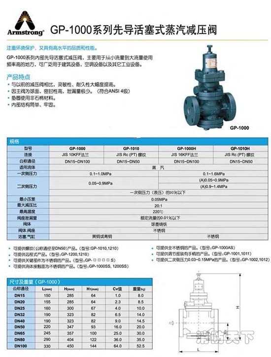 阿姆斯壯GP-1000系列減壓閥用于精確調節多種范圍的流體壓力。由于采用了內導式設計,因此無須外部零件和接管。