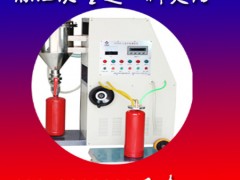 常規灌粉:工作時灌粉閥和一閥門為開狀態,壓縮空氣電池閥、真空泵電磁閥、吸粉電磁閥、一電磁閥、第二閥門、泄壓閥處于關閉狀態,真空泵啟動,同時真空泵電磁閥打開,通過一電接點真空表檢測系統真空度,當系統真空度達到設定要求時真空泵停止工作,通過第二電接點真空表檢測灌裝系統真空度,當真空度達到設定要求時系統進入干粉灌裝的待設備狀態。滅火器罐體進入設定位置,頂升裝置將滅火器罐體頂起,限位稱重裝置自動記錄滅火器皮重,吸粉電磁閥打開開始進入快速灌裝,同時為防止干粉料倉干粉堵塞,系統定時向第三氣錘發送脈沖敲擊干粉料倉倉壁。當滅火器內干粉達到設定的快速灌裝量時,流量控制閥動作進入慢速灌裝直到達到設定的灌裝量時停止灌裝。吸粉電磁閥關閉,泄壓閥打開快速降低滅火器及管道內的真空度,穩定后頂升裝置放下灌裝好的滅火器,進入下一個滅火器灌裝。