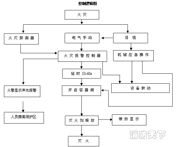 (2)電器手動:將控制器上的控制方式選擇鎖置于“手動”位置時,滅火控制器處于手動控制狀態。這時,當火災探測器發出火警信號時,控制器即發出火災聲、光報警信號,而不啟動滅火裝置,需經人員觀察,確認火災已發生時,可按下保護區外或控制器操作面板上的“緊急啟動按鈕”,即可啟動滅火裝置,釋放滅火劑,實施滅火。但報警信號仍存在。無論裝置處于自動或手動狀態,按下任何緊急啟動按扭,都可啟動滅火裝置,釋放滅火劑,實施滅火。同時控制器立即進入滅火報警狀態。