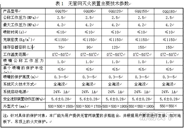 七氟丙烷(HFC-227ea、FM-200)是無色、無味、不導電、無二次污染的氣體,具有清潔、低毒、電絕緣性好,滅火效率高的特點,特別是它對臭氧層無破壞,在大氣中的殘留時間比較短,其環保性能明顯優于鹵代烷,是目前為止研究開發比較成功的一種潔凈氣體滅火劑,被認為是替代鹵代烷1301、1211的最理想的產品之一。GQQ型七氟丙烷無管網自動滅火裝置,它是一種不安裝管網、輕便可移動的氣體滅火消防設備。符合《柜式氣體滅火裝置性能要求和試驗方法》及ISO14520- 9《氣體滅火系統-物理性能和系統設計》系統設計及產品標準規范的要求,本系統裝置設計先進、性能可靠,極其適用于保護面積小于500m2,容積小于1600m3,管網無法安裝,維護困難的保護對象的火災防護。