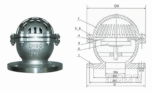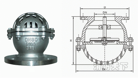 底閥由閥體,閥瓣,閥蓋,襯套,密封圈等零件組成,詳見下圖水源的水從閥蓋進入閥體。在流體的壓力作用下,閥瓣打開水,當示停后出口管內的壓力將閥瓣迅速關閉,液體將不會倒回水源,起到了即暢通抽水又節約水能損失的作用。