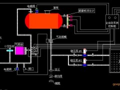日常穩(wěn)壓泵工作時將水送至管網(wǎng)和氣壓水罐,當氣壓水罐內(nèi)液位達到設(shè)定值上限時,補水泵停止工作。壓力不足時補氣系統(tǒng)工作,當壓力升至穩(wěn)壓上限時,停止補氣。通常系統(tǒng)漏水原因造成管網(wǎng)壓力下降,由液位控制器控制穩(wěn)壓泵啟動補水;系統(tǒng)氣量缺失由壓力控制器控制補氣系統(tǒng)(空氣壓縮機)啟停補氣;這樣氣壓水罐日常能做到氣液平衡,壓力與液位互鎖。當發(fā)生火情時,消防信號輸入,氣體頂壓系統(tǒng)工作將動力氣源減壓釋放,均勻充入氣壓水罐里將水頂入消防管網(wǎng),向管網(wǎng)提供不少于10min的消防用水。
