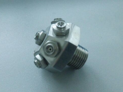 由本體、噴霧芯、噴霧嘴、防塵罩、過濾網等構成,一定壓力的水通過過濾網進入噴頭后,在噴霧嘴內相互旋轉產生動能,經混合腔由噴嘴體形成的一定角度噴霧而出。