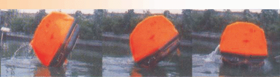充脹方式:救生筏從船上投落后即可自動充脹展開,即使船舶瞬間沉沒未做投落操作,筏在靜水壓力釋放器的作用下仍可從水中浮出并自動充脹展開。