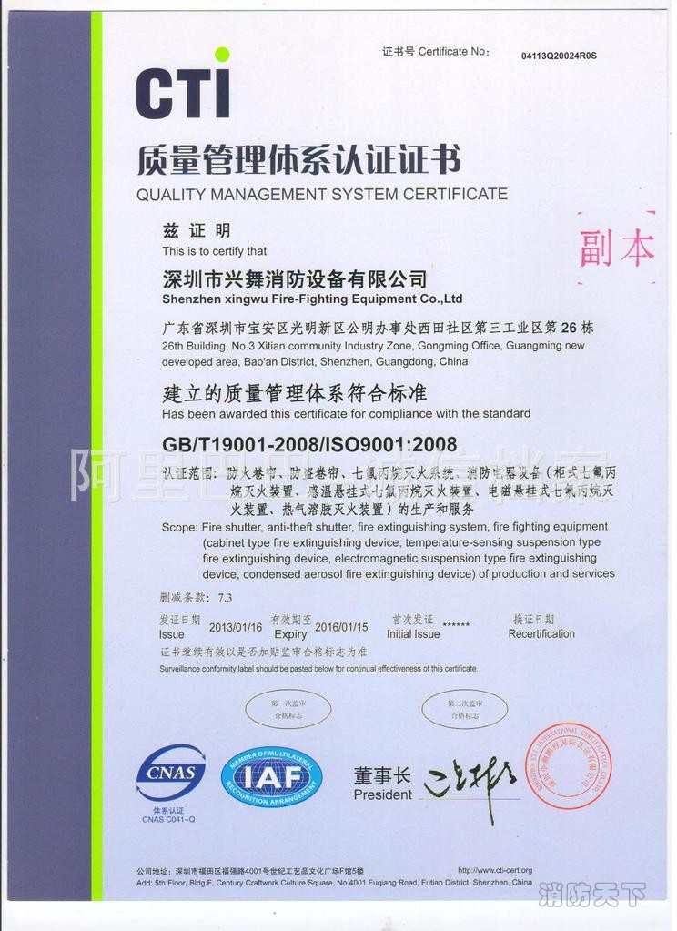 經過半年的努力,公司建立和實施了ISO9001質量管理體系,順利通過了中國質量認證中心關于ISO9001質量管理體系的認證和審核,于2013年01月16日獲得了ISO9001質量管理體系認證證書。