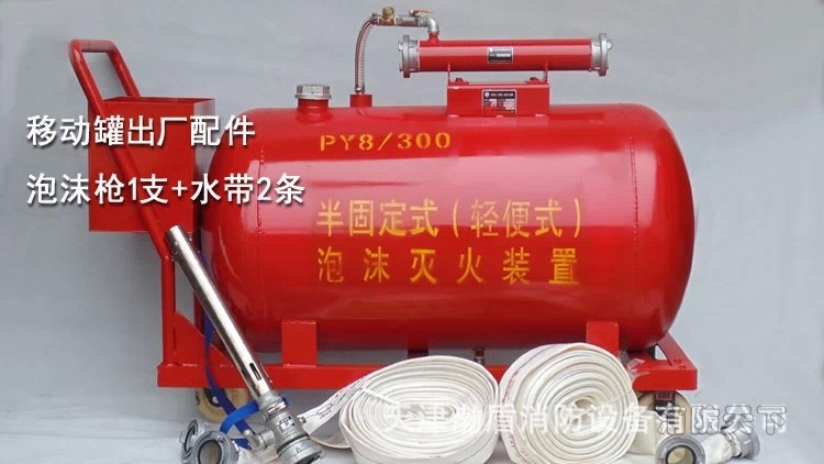 渤盾生產的移動泡沫滅火車采用的半固定方式為推車式,將泡沫罐罐體和比例混合裝置等整體焊接在一個車架上,配上車輪,即成為了推車式的泡沫滅火裝置。在火災發生初期時,消防人員可以推著移動泡沫滅火車機動靈活的到達火災現場,使用配套的泡沫槍進行滅火。