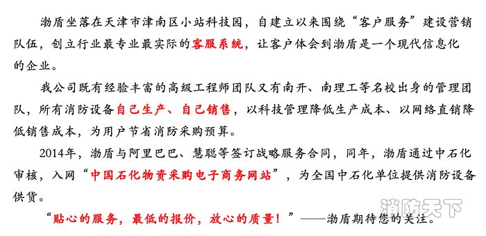 渤盾品牌消防設備采購攻略:百度“天津渤盾消防設備有限公司”或者直接訪問www.tjbd119.com或www.tjbd119.cn,進入渤盾官網,查看渤盾在線客服聯系方式,在線同客服溝通,即可獲取消防噴淋裝置最低報價。