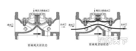 雨淋閥也可配濕式或干式控制管網(wǎng),組成濕式或干式控制系統(tǒng),當(dāng)控制管網(wǎng)的噴頭爆裂使隔膜腔的水壓下降,閥打開(kāi)。