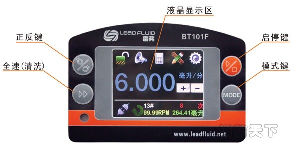 BT101F分配型智能蠕動泵流量范圍0.00011~720毫升/分鐘。采用彩色液晶和觸摸屏技術,操作界面簡單,直觀,明了。主要適用于各種復雜的液體定量分配,適用于精確計量和定量給料,可以實現高精度的流量傳輸控制。對液量分裝精度要求高時,使用液量分配模式更加方便;對產量要求高時,使用時間分配模式更加方便;需要將一定液體分裝為若干份液體時請使用復制分配模式。設置為流量模式時,完全等同于一臺流量型蠕動泵。為了減小不必要的風扇噪音,采用了智能溫控技術。在RS485通訊中,因為采用了MODBUS協議,更易于與其他控制設備如計算機,人機界面,PLC等連接。