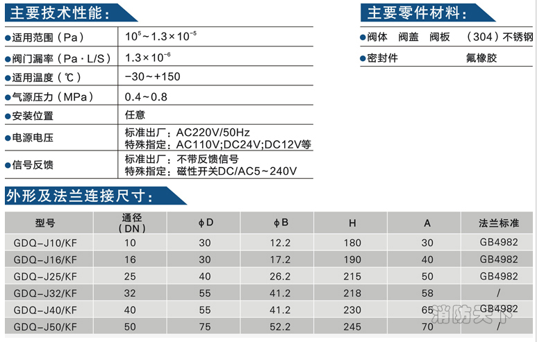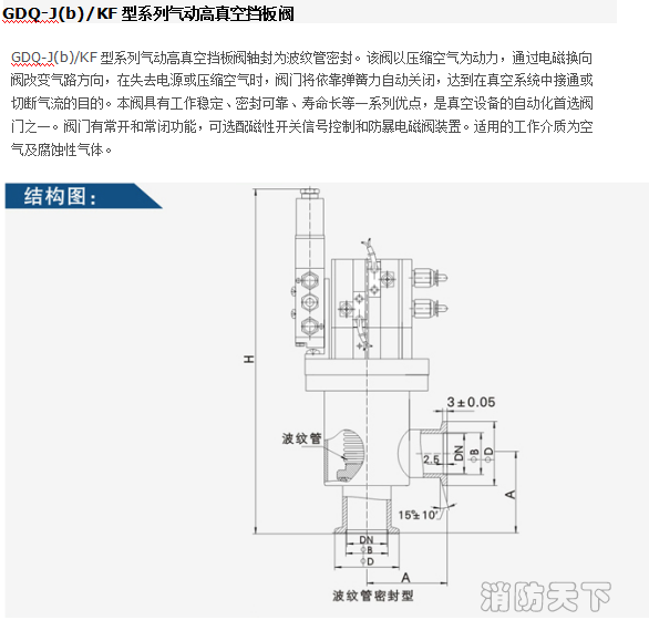 GDQ-J/KF型系列氣動高真空擋板閥采用氟橡膠軸封密封,是用于真空系統(tǒng)中開啟或切斷氣流的真空閥門。閥門以壓縮空氣為動力。通過氣缸執(zhí)行,電磁換向閥改變氣路方向帶動閥杠上下運動,達到閥板開啟或關(guān)閉的目的。本閥門性能可靠、壽命長等優(yōu)點,閥門具有常開和常閉功能,可選配磁性開關(guān)信號控制和防爆電磁閥裝置。適用的工作介質(zhì)為空氣及非腐蝕性氣體。