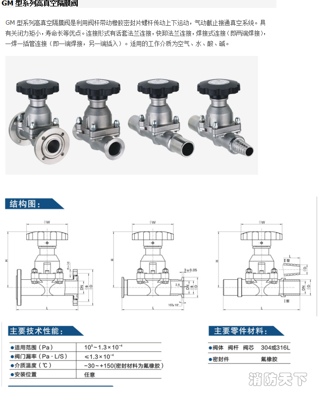 GM型系列高真空隔膜閥是利用閥桿帶動橡膠密封片螺桿傳動上下運動,氣動截止接通真空系統。具有關閉力矩小,壽命長等優點。連接形式有活套法蘭連接,快卸法蘭連接,焊接式連接(即兩端焊接),一焊一插管連接(即一端焊接,另一端插入)。適用的工作介質為空氣、水、酸、堿。