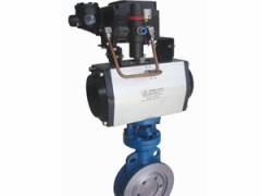 氣動調節蝶閥是一種(閥板)繞垂直于通道的固定軸旋轉的閥門,其由活塞式雙作用或單作用(彈簧復位式)氣動執行器和蝶形閥組成,屬旋轉高性能型調節或切斷閥類,配用電-氣閥門定位器或電磁閥、空氣過濾減壓器、限位開關(閥位回訊器),可實現對工藝管路中流體介質的比例調節和二位切斷控制,從而達到對流體介質的流量、壓力、溫度、液位等參數的自動化控制。廣泛適用于氣體、濁液體、濃漿液或灰粉、懸浮顆粒類等介質 1.氣動蝶閥操作力矩小,是所有閥類中操作力矩最小的一種,啟閉迅速,以壓縮空氣為動力,通過活塞齒條,齒輪的機械傳動閥桿,以角行程輸出的扭矩轉動閥板0~90°,就能快速的完成啟閉動作,結構簡單、體積小、重量輕、流阻小、流量系數大,密封性能好。調節范圍大。是自動化控制系統中儀表的執行單元; 2.采用電-氣閥門定位器,以電信號和壓縮空氣為動力,接受控制系統輸入的0-10mA DC或4-20mA DC電流信號,由調節器將壓縮空氣,轉換成氣源壓力信號輸入輸出,改變閥板的旋轉角度(0-90° 任意角度),具有較好的調節控制流量等參數。 3.采用電磁換向閥、閥位回訊器,以AC220V或DC24V電源電壓和壓縮空氣作動力,實現對流體介質的快速二位切斷控制。 4.氣動執行機構采用活塞式氣缸及曲臂轉換結構,輸出力矩大,體積精小,采用全密封防水設計防護等級高。氣缸體采用鏡面氣缸,無油潤滑,磨擦系數小、耐腐蝕、具有超強的耐用性及可靠性。所有傳動軸承均采用邊界自潤滑軸承無油潤滑,確保傳動軸不摩損。