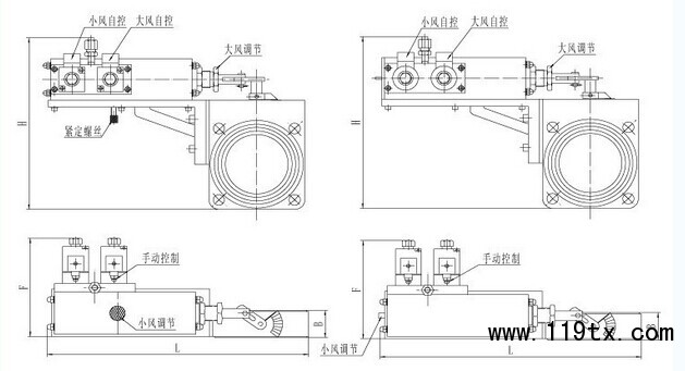 為滿足特殊用戶的需要,本公司還開發(fā)了DQSW3型氣動三位蝶閥和DQSW1型氣動單電控雙位蝶閥。氣動三位蝶閥分大風(fēng)、中風(fēng)、小風(fēng)三種風(fēng),最大開度分別為90°、65°、35°,分別用三個先導(dǎo)電磁閥控制。中風(fēng)、小風(fēng)為燒咀燃燒所需的風(fēng)量,大風(fēng)為冷卻工件用的風(fēng),滿足了特定工藝,降溫曲線也要控制的場合。DQSW1型氣動單電控雙位蝶閥的小風(fēng)開度為0—35°可調(diào),并且是常開的;大風(fēng)35°—90°范圍內(nèi)任意可調(diào)。