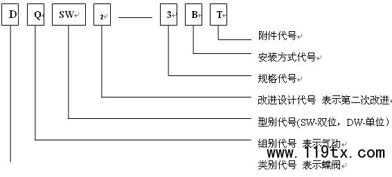DQSW2 — 3BT表示經(jīng)第二次改進的、帶氣源三聯(lián)件的、通徑為¢175的、水平安裝的氣動雙位蝶閥。