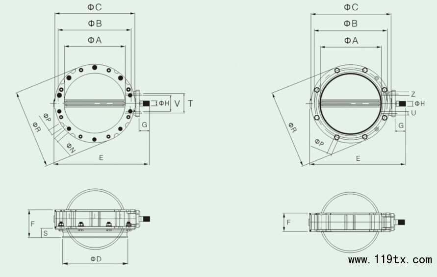 | 單法蘭蝴蝶閥 | 含一個上法蘭和下部配有一個伸出的連接環用以安裝軟套管 |