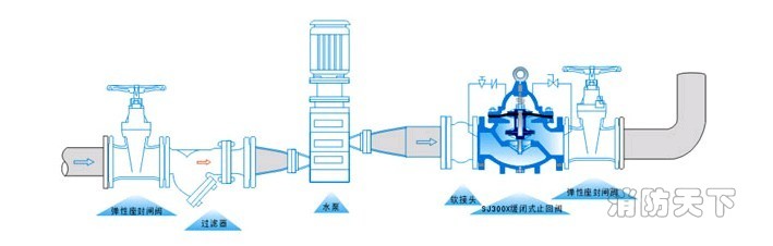 該閥主要用于給水系統的水泵出口處,防止介質倒流,水錘及水擊現象,該閥兼具電動閥、逆止閥和水錘消除器三種功能,可有效地提高供水系統的安全可靠性,并將緩開、速閉、緩閉消除水錘的技術原理一體化,防止開泵水錘和停泵水錘的產生,只需操作水泵電動啟閉,閥門即可按照水泵操作規程自動實現啟閉,該閥流量大,壓力損失小,密封性能可靠,安裝維護、調試檢查方便、使用壽命長。