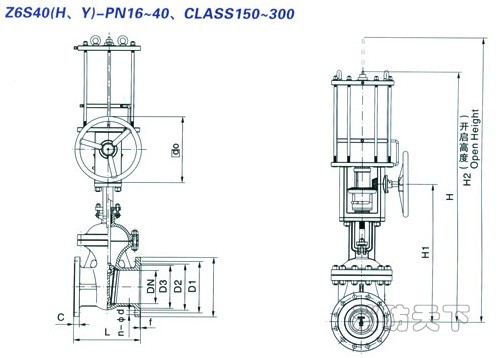 4、氣缸蓋上部裝有氣動-手動轉(zhuǎn)換裝置。將轉(zhuǎn)換手柄順時針方向提轉(zhuǎn)到“氣動”定位孔定位,閘閥處于氣動操作狀態(tài);反之,將轉(zhuǎn)換手柄逆時針方向提轉(zhuǎn)到“手動”定于孔處定位,閘閥即可進行手動操作。帶錐齒輪的手柄轉(zhuǎn)換方向相反。手動操作閘閥時,手輪旋向和普通手動閥一樣,即順時針轉(zhuǎn)為關(guān),逆時針轉(zhuǎn)為開。帶錐齒輪轉(zhuǎn)動的相反。