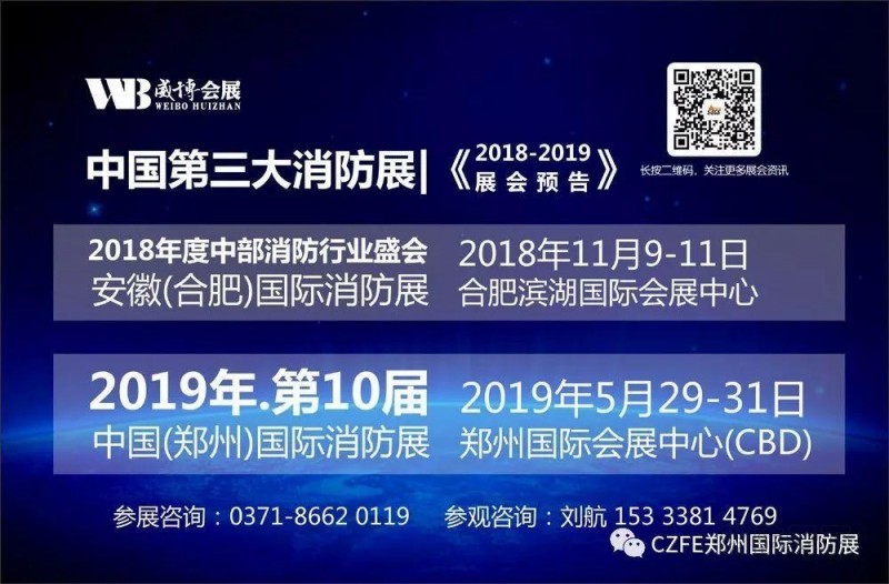 由威博會展|CZFE鄭州國際消防展組委會打造的2018安徽(合肥)國際消防展,將于11月9日-11日在合肥濱湖國際會展中心盛大召開,展覽面積10000平米,展位設立500個,參展企業230家(中部消防科技產品采購盛會)!