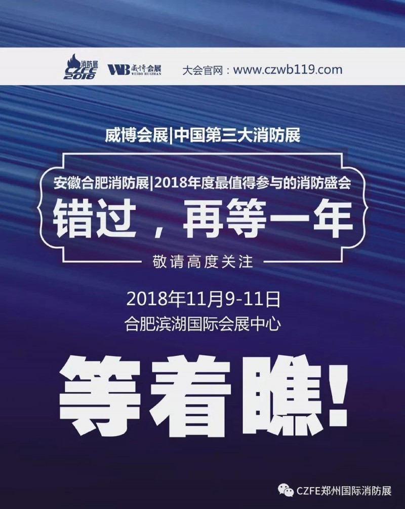 由威博會展|CZFE鄭州國際消防展組委會聯合安徽省合肥房地產協會、物業管理協會、消防主管部門/協會、房地產商、消防工程安裝單位、消防器材經銷代理商聯合呈現的2018年安徽(合肥)國際消防設備技術交流展覽會于11月9日-11日在濱湖國際會展中心(5號館)盛大召開。
