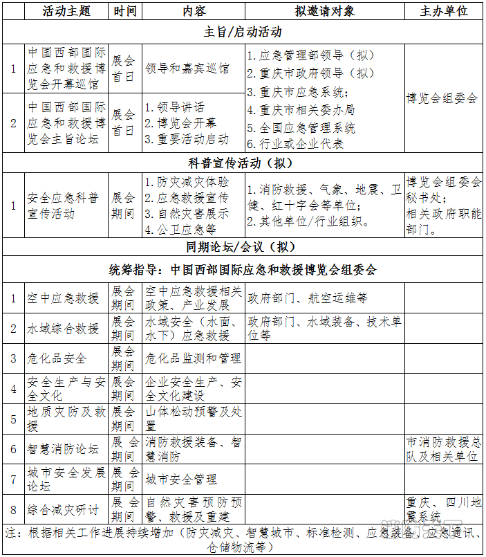 將舉辦應急和救援博覽會主旨論壇、災種專題論壇、企業論壇會議、安全應急科普、企業推介/產品路演、應急演練等活動(詳見附件1)。