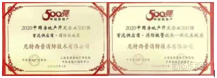2020-2022年尼特連續3年獲評為中國房地產開發企業500強“消防報警疏散一體化系統類”首選供應商