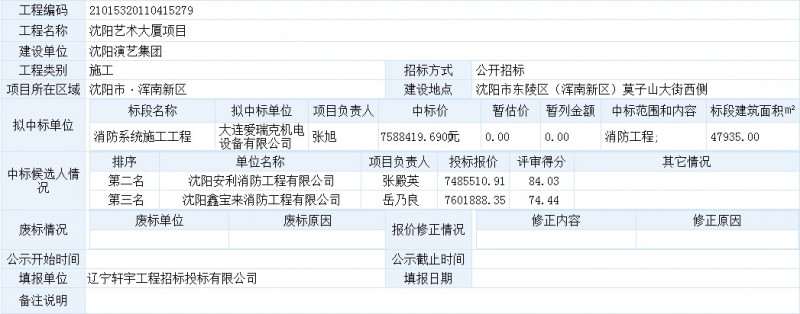 遼寧沈陽藝術(shù)大廈項目消防系統(tǒng)施工工程擬中標(biāo)公示