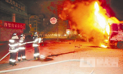 當(dāng)晚9時(shí)10分,曾都消防中隊(duì)接警稱:擂鼓墩大道博物館廣場(chǎng)路邊一輛載有9桶柴油的貨柜車突然爆炸,急需救援。救援官兵到達(dá)現(xiàn)場(chǎng)后,分別用水槍、泡沫槍對(duì)著火柴油桶進(jìn)行降溫,防止發(fā)生第二次爆炸。30分鐘后,大火被撲滅。