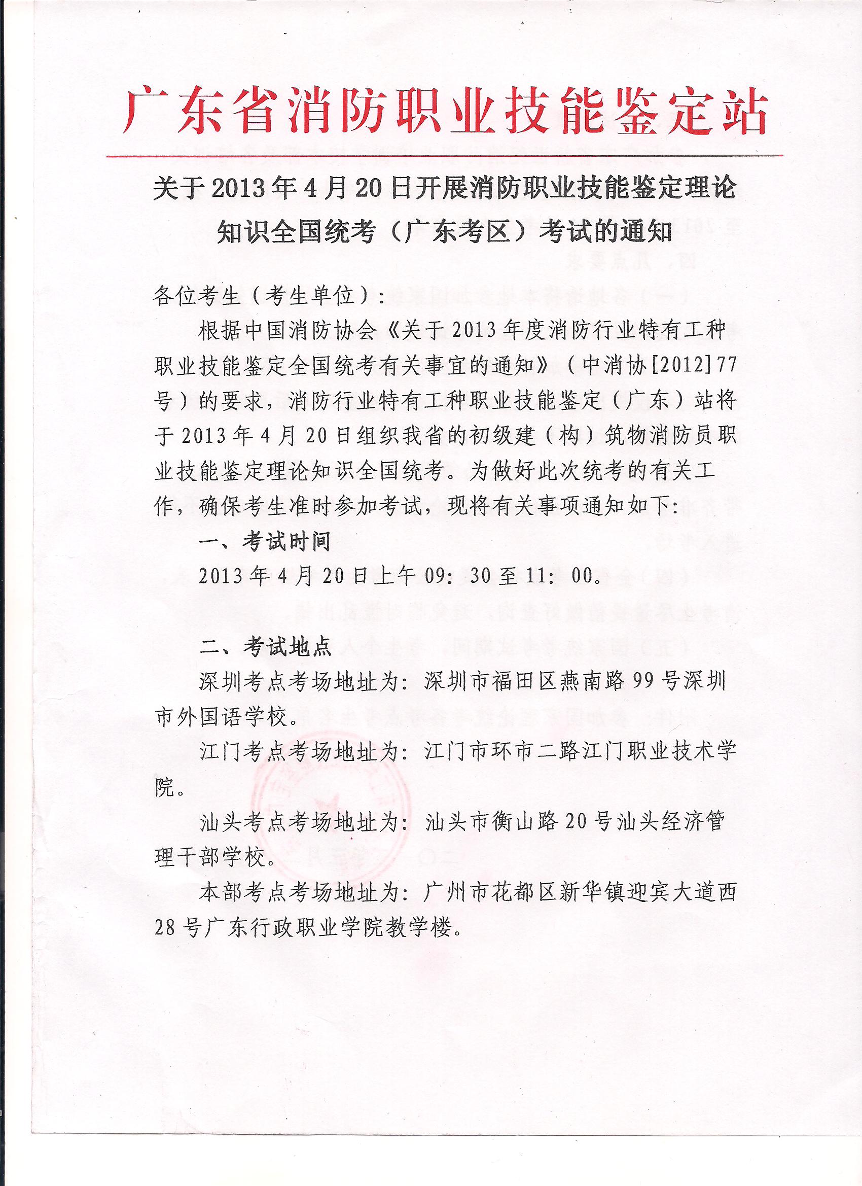 根據中國消防協會《關于2013年度消防行業特有工種職業技能鑒定全國統考有關事宜的通知》(中消協[2012]77號)的要求,消防行業特有工種職業技能鑒定(廣東)站將于2013年4月20日組織我省的初級建(構)筑物消防員職業技能鑒定理論知識全國統考。為做好此次統考的有關工作,確保考生準時參加考試,現將有關事項通知如下: