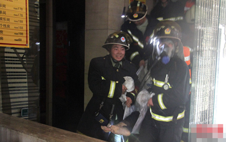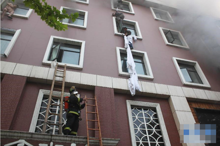 4月14日,消防隊(duì)員從失火的酒店救出受傷人員。
