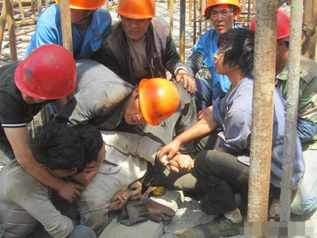 在現場,消防人員看到跌落的工人被一根約1米長、粗約1.5厘米粗的鋼筋穿過了大腿根部。由于劇痛,工人表情十分痛苦,不停呻吟。旁邊工友安慰著傷者。見傷情嚴重,消防隊員立即在現場展開了救援。幾名消防隊員穩住傷員,由一名消防隊員采用無齒鋸將鋼筋的一段切除。并隨即將傷員送上救護車,以進一步進行治療。