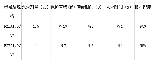 據(jù)相關(guān)資料,這種滅火裝置有FZBA1.5/YS型和FZBA1.0/YS型非貯壓壁裝式超細干粉滅火裝置兩種規(guī)格。