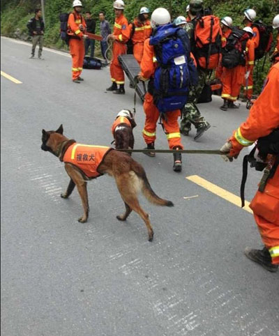 消防天下網訊 可愛的搜救犬們跟隨消防官兵徒步前往地震災區。