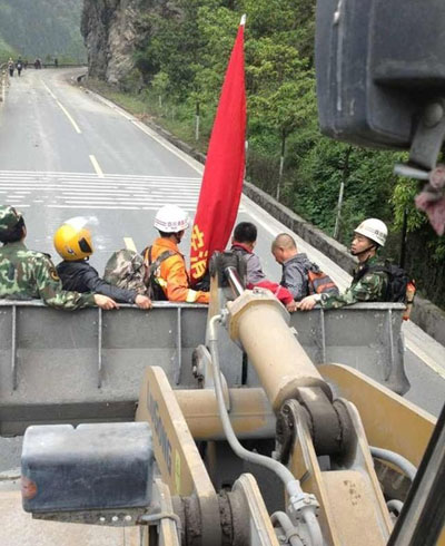 消防天下網訊 在挖掘機能通行的路段,司機主動要求送消防官兵一程,減少官兵徒步路程,也讓消防官兵能盡快趕到災區開展救援。