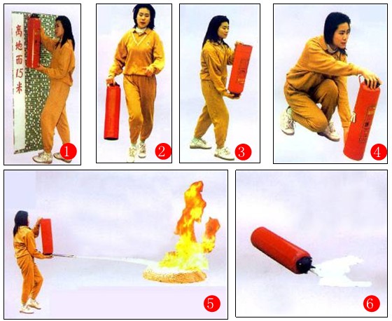 ⑥滅火后,把滅火器臥放在地上,噴嘴朝下。