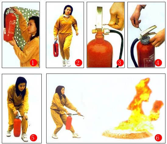 ⑥在距火焰2米的地方,右手用力壓下壓把,左手拿著噴管左右擺動,噴射干粉覆蓋整個燃燒區。