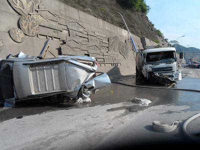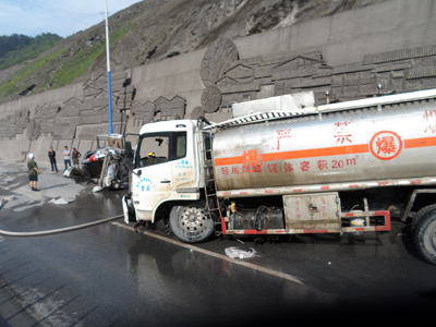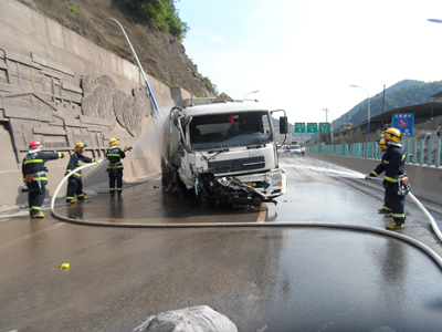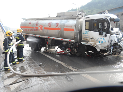 16時26分中隊官兵到達現場后,只見現場一片狼藉,一輛車牌號為渝BG8612的油罐車橫側在高速路上,油罐車的車頭已發生嚴重變形,空氣中彌漫著刺鼻的柴油味,地上到處都是柴油,在距離油罐車前方10米處的地方還有一輛長安車側翻。指揮員見狀立即下令將中隊官兵分為四個戰斗小組,戰斗一組對現場情況實施警戒,事故現場周圍100米內嚴禁無關人員和車輛靠近;戰斗二組立即對油罐車和長安車進行偵查,找到油罐車罐體破裂的位置,和查看車內是否有人員被困。通過偵查發現油罐車的罐體溫度較高,在油罐車罐體的右上方有輕微的破裂,并且不時有柴油從裂縫中漏出,油罐車和長安車內都無人員被困。指揮員得知這一情況后,立即下令戰斗三組和戰斗四組出兩只開花水槍對油罐車進行冷卻降溫。經過30多分鐘的處置油罐車的罐體溫度已被降低,同時對油罐車罐體泄露處進行了相應的封堵。確保無二次災害的發生后將現場移交給當地交警部門。