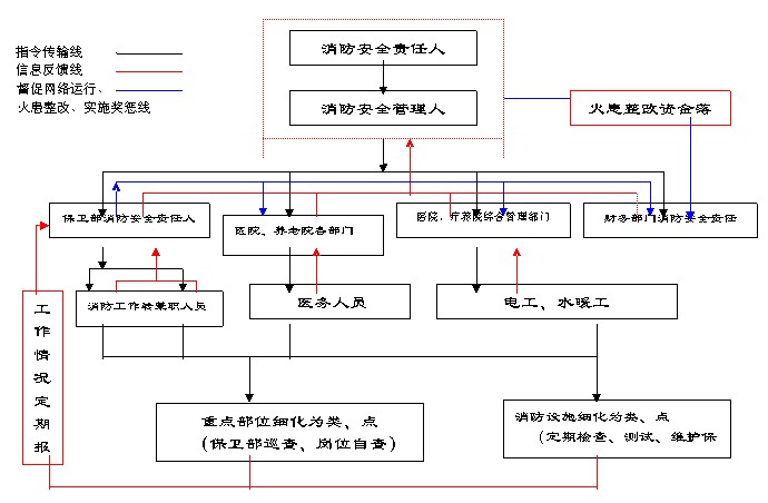 醫院、療養院應當根據需要本單位的消防安全管理人。消防安全管理人對單位的消防安全責任人負責(通常由單位的行政副職領導擔任)。消防安全管理人負責實施和組織落實下列消防安全管理工作: