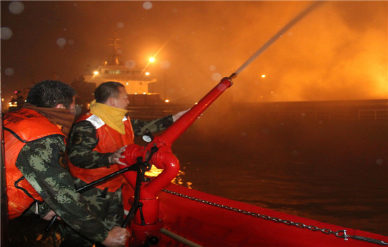 接到報警后,這個支隊海警33032艇緊急啟航,火速趕往事發(fā)地。行駛約10分鐘后,發(fā)現(xiàn)了正冒著濃煙的貨船,此時,滾滾的濃煙已經(jīng)將貨船層層包圍,火勢有進一步蔓延的趨勢。因無法近距離靠近火災船只進行救火,該艇迅速組織全體官兵用配備在艇上的兩支高壓水槍對貨船噴射,經(jīng)過10多分鐘的撲救,該船上的明火基本被撲滅。
