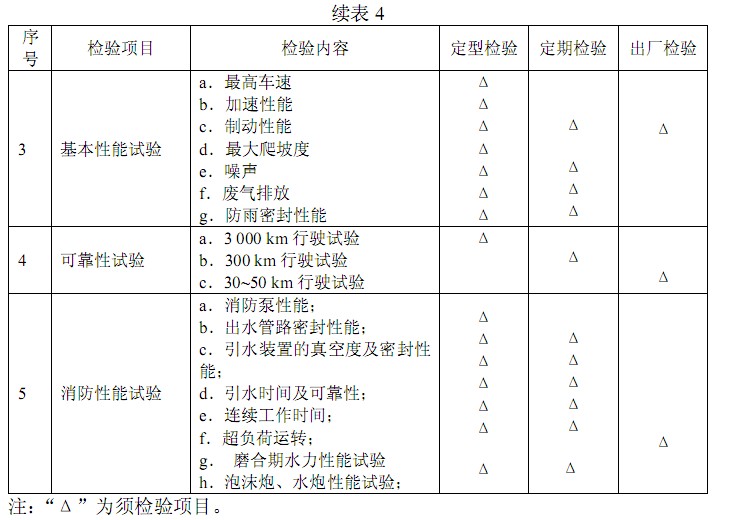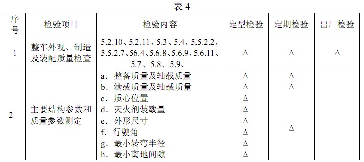 泡沫車(chē)的定型檢驗(yàn),定期檢驗(yàn)和出廠(chǎng)檢驗(yàn)項(xiàng)目及內(nèi)容按表4 的規(guī)定。