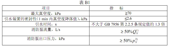 B2.1 引水裝置的真空度及密封性、引水時(shí)間及可靠性試驗(yàn)方法按GB 7956 第3.8、和3.9 條的規(guī)定進(jìn)行,其結(jié)果應(yīng)符合表B1 的規(guī)定。