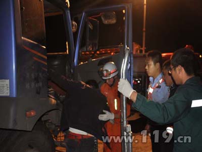2時58分,消防力量到達現場。中隊指揮員首先命令警戒組根據道路情況圍繞事故車輛設置警戒,嚴防二次交通事故發生。其次,命令安全員觀察車輛油箱情況,防止車輛漏油引發火災。3時整,根據對事故現場進行勘查發現:兩車發生追尾,后車駕駛室嚴重損壞變形,駕駛員被變形的駕駛室卡住無法動彈,非常危險。綜合考慮后,指揮員立即命令一名身材瘦小的戰士深入變形駕駛室內,對內部進行觀察,經觀察,被困司機被卡在方向盤和座椅之間,掌握情況后,指揮員命令一名戰士利用液壓擴張器和液壓頂桿對被困人員進行救援。